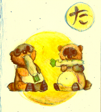 「たぬきが だいこん たべている」という文で絵に。
