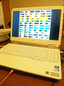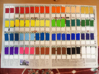それを見ながら絵の具で同じ色をつくり、実際の紙に塗るという方法をとっています。