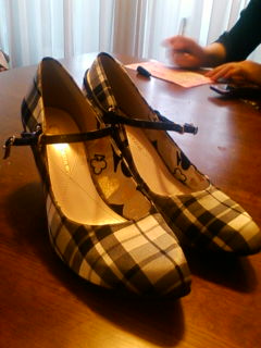 白と黒とうすいピンクのチェック柄で、低めのヒールかつ履きやすく歩きやすい 理想的な靴。